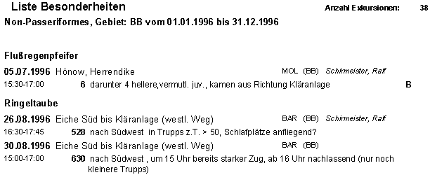 Der Normalfall dürfte die Auswertung nach Arten sein. Hier erkennt OrniDB selbständig, was für eine Abfrage zugrunde liegt. Die Sortierung erfolgt nach Systematik und Datum.