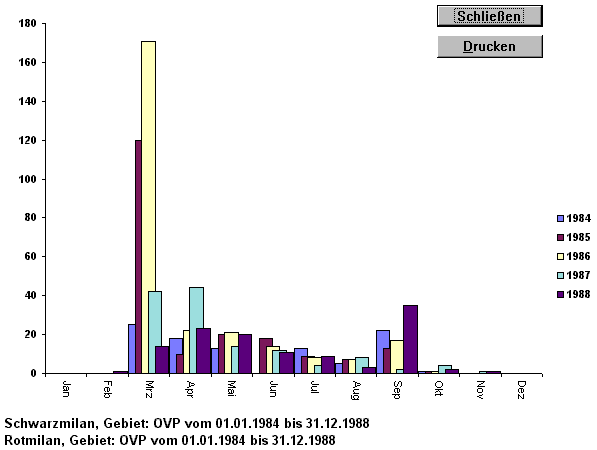 Oft werden große Datenmengen erst grafisch anschaulich. OrniDB kann neben der speziellen Auswertung nach Zeitspannen zusätzlich aus anderen Auswahlformularen gewonnene Monatssummen als normales oder gestapeltes Säulendiagramm darstellen. Ein Ausdruck ist möglich. Weitere Diagramme stellt die Funktion Auswertung nach Zeitspannen bereit. | ||||||||||||||||||||||||||||||||||||||||||||||||||||||||||||||||