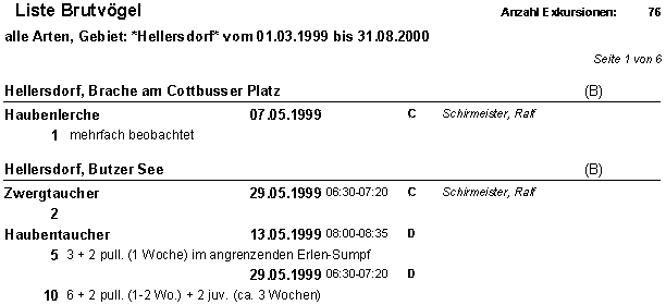 Bei der Ortsliste wird zunächst alphabetisch nach Orten und dann nach Art und Datum sortiert. Beispiel für eine Brutvogelauswertung aus "Suche nach Kriterien":