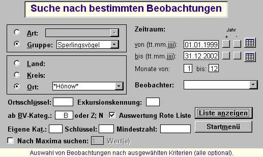 Mit diesem Formular können Sie sehr komplexe Abfragen durch beliebiges Kombinieren der Kriterien selbst gestalten (z.B. Anzeige von Brut- oder Zugvögeln). Mit einem wiederholten Aufruf der Maske kann man unterschiedlichste Abfragen in einen Auswertungsbestand zusammenführen. |