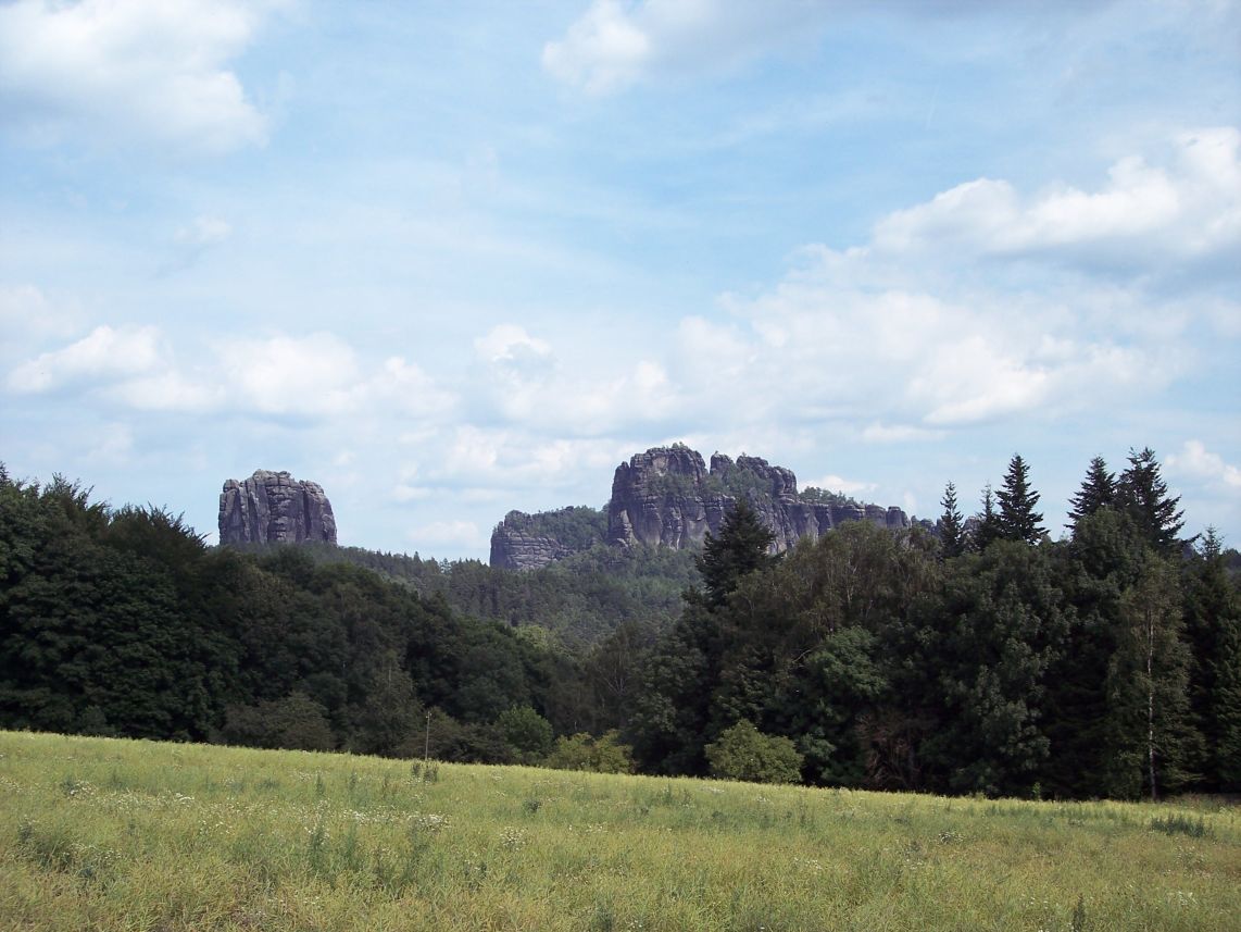 Blick auf den solitären Falkenstein (links) und das Schrammstein-Massiv, beliebtes Ausflugs- und Kletterziel im Nationalpark.