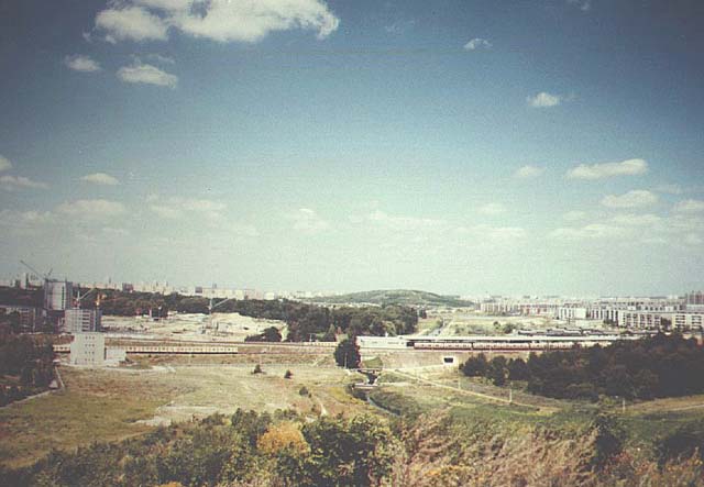 Blick vom Biesdorfer Berg nach Norden zum U-/S-Bahnhof Wuhletal und den Plattenbausiedlungen Marzahn (links) mit der im Bau befindlichen Krankenhauserweiterung und Hellersdorf (rechts) sowie dem Kienberg (Mitte). Zum Zeitpunkt der Aufnahme (1989) waren beide Berge noch niedrig bewachsen. Am linken und rechten Bildrand befinden sich zwei alte Friedhofsanlagen. Der Wald im Mittelgrund gehört größtenteils zum Krankenhausgelände, nur der rechte Teil trägt Auwaldcharakter. Dahinter liegt eine Kleingartenanlage. Hinter dem Bahnhof befinden sich mit den Kaulsdorfer Teichen Reste der ehem. Rieselfeldlandschaft mit z. T. gut ausgebildeten Röhrichtbeständen. | ||||||||||||||||||||||||||||||||||||||||||||||||||||||||||||||||||