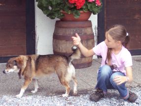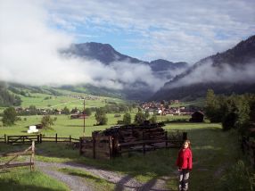 Zusätzlich zu den schon obligatorischen Wünschen (Bahnanschluss, Hallenbad, Bäche, hohe Berge, Seilbahn, große Ferienwohnung usw.) sollte es diesmal auf Lauras Wunsch Urlaub auf dem Bauernhof sein, wovon aber Stefan wenig hielt. Den idealen Kompromiss fanden wir nach längerer Suche im Gasteiner Tal. Neben einem richtigen" Bauernhof lag ein geräumiges Feriendomizil am Rande von Maierhofen, einem Ortsteil von Dorfgastein. Durch die leicht abseitige Lage war das Brötchenholen zwar schwieriger als sonst, der 45-minütige Morgenspaziergang war jedoch nie eine Qual, sondern der jeweils stimmungsvolle Auftakt wunderschöner Ferientage. | |