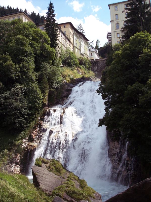 Wahrzeichen von Bad Gastein ist der direkt durch den Ort brausende Wasserfall. Im Ort gibt es etliche altehrürdige "Belle Epoque"-Hotelanlagen, bei denen die Zeit stehen geblieben scheint. Vor Bausünden der neueren Zeit macht man leider auch nicht halt. Trotz (oder wegen?) der grandiosen Lage macht der Ort einen recht verbauten und gedrängten Eindruck. |