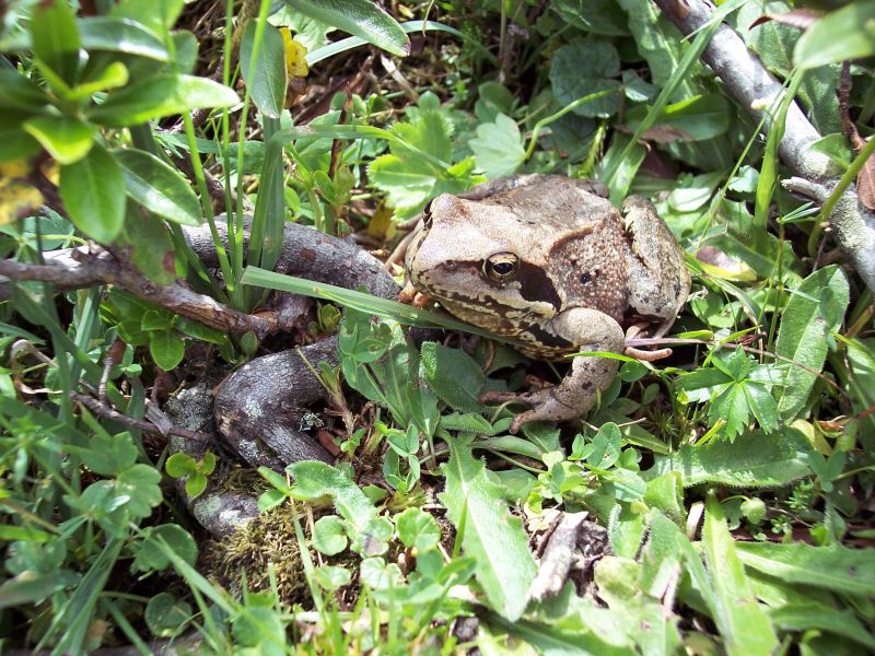 Dir Frösche waren vermutlich noch am ehesten mit dem Wetter zufrieden. Diesem Grasfrosch half das Abducken jedenfalls nicht davor, fotografiert zu werden. Schade, dass unsere erste Äskulapnatter die wir an einem Bachufer fanden, zu schnell wieder verschwunden war. | |