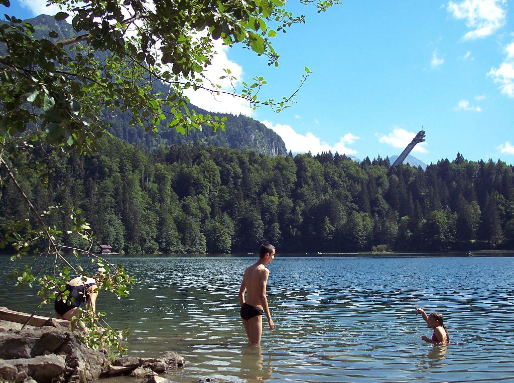 In Sichtweite der Skiflugschanze liegt weit über Oberstdorf der Freibergsee, ein beliebtes Waldbad. Auch wenn das klare Wasser ziemlich kalt war, für eine Runde baden und Boot fahren war es ideal. Sehr zu empfehlen ist auch die kleine preiswerte Gaststätte des Freibades mit schmackhafter bayerischer Küche. | |