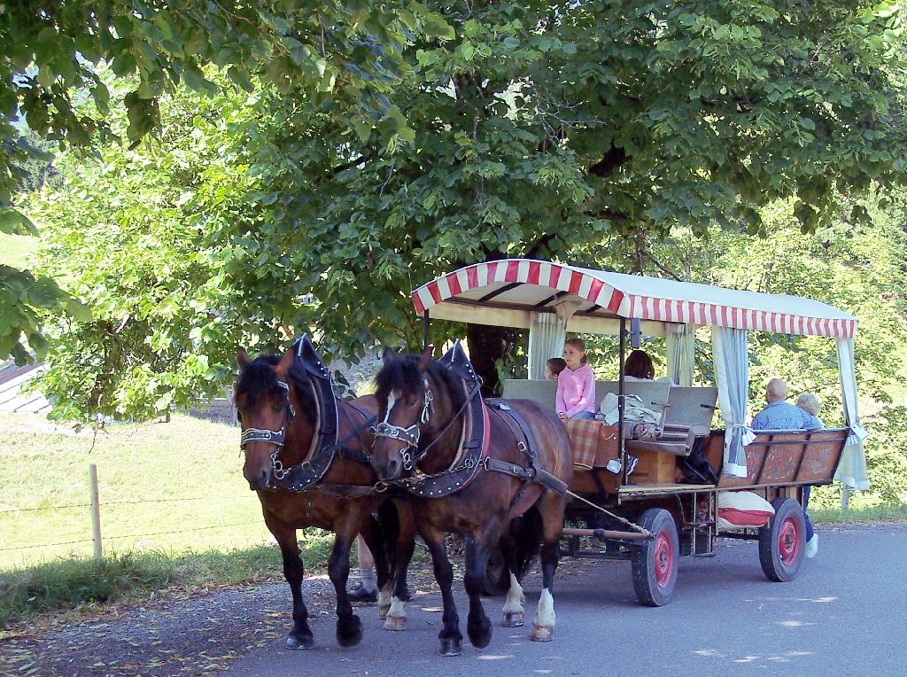 Einer der Urlaubshöhepunkte für Laura wir eine mehrstündige Kutschfahrt durch das Trettachtal. Aber auch wir (natürlich ohne Stefan) genossen das gemütliche Tempo bei sommerlicher Wärme. Am Ziel in Spielmannsau war Gelegenheit zum Wandern und Picknicken, bevor es wieder bergab zurück ging. | |