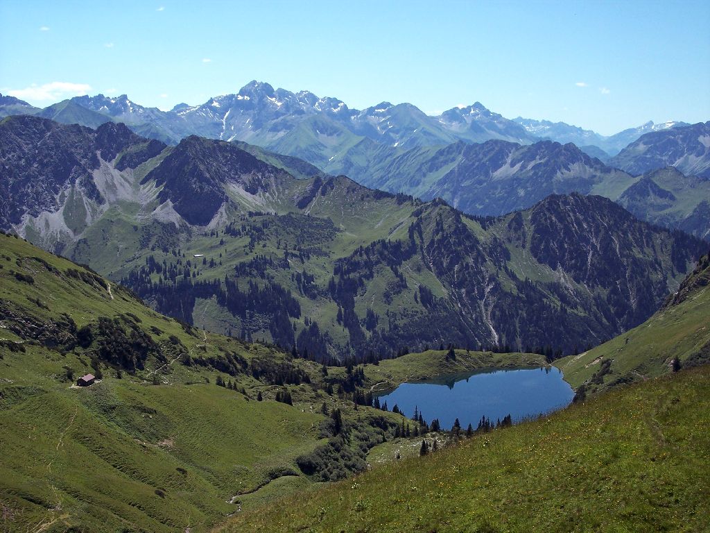 Von der Mittelstation der Nebelhornbahn in der Richtung der Höfats liegt der Seealpsee, dahinter geht es steil bergab. Bis dahin kamen wir aber ohnehin nicht, wir hatten uns bei der Entfernung bis zum See ganz erheblich verschätzt. Außerdem waren unterwegs viele Blumen, Schmetterlinge, Bäche und ein letztes Schneefeld. | |