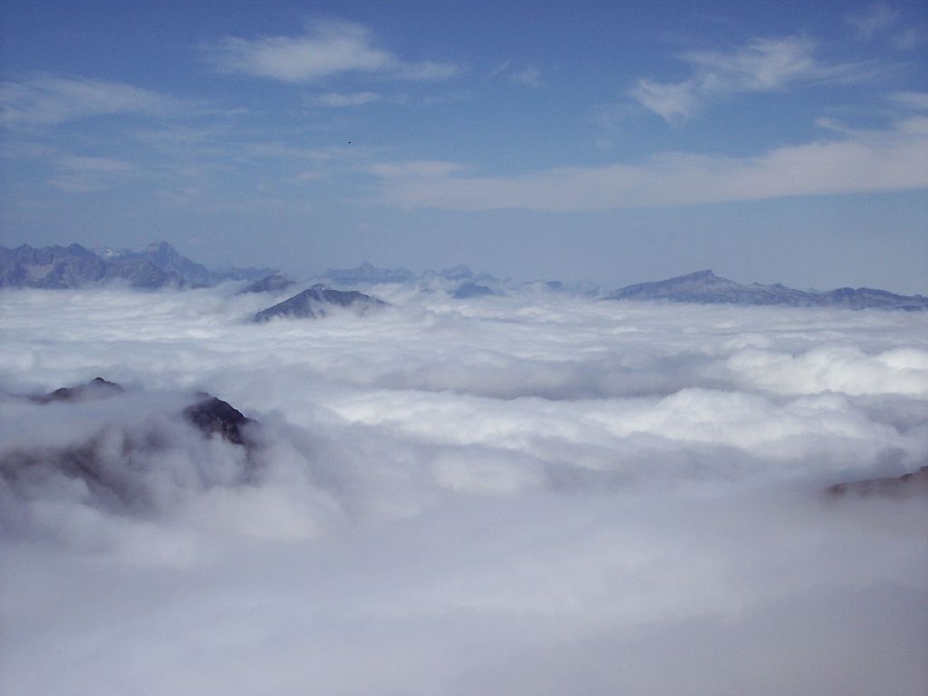 Unsere zweite Tour auf das Nebelhorn begannen wir bei trübem und nebligem Wetter an der Talstation. Nach einer Seilbahnfahrt durch die Wolken bot sich ein faszinierender Blick auf ein Wolkenmeer mit schroffen Inseln und sich ständig ändernden Formationen. | |