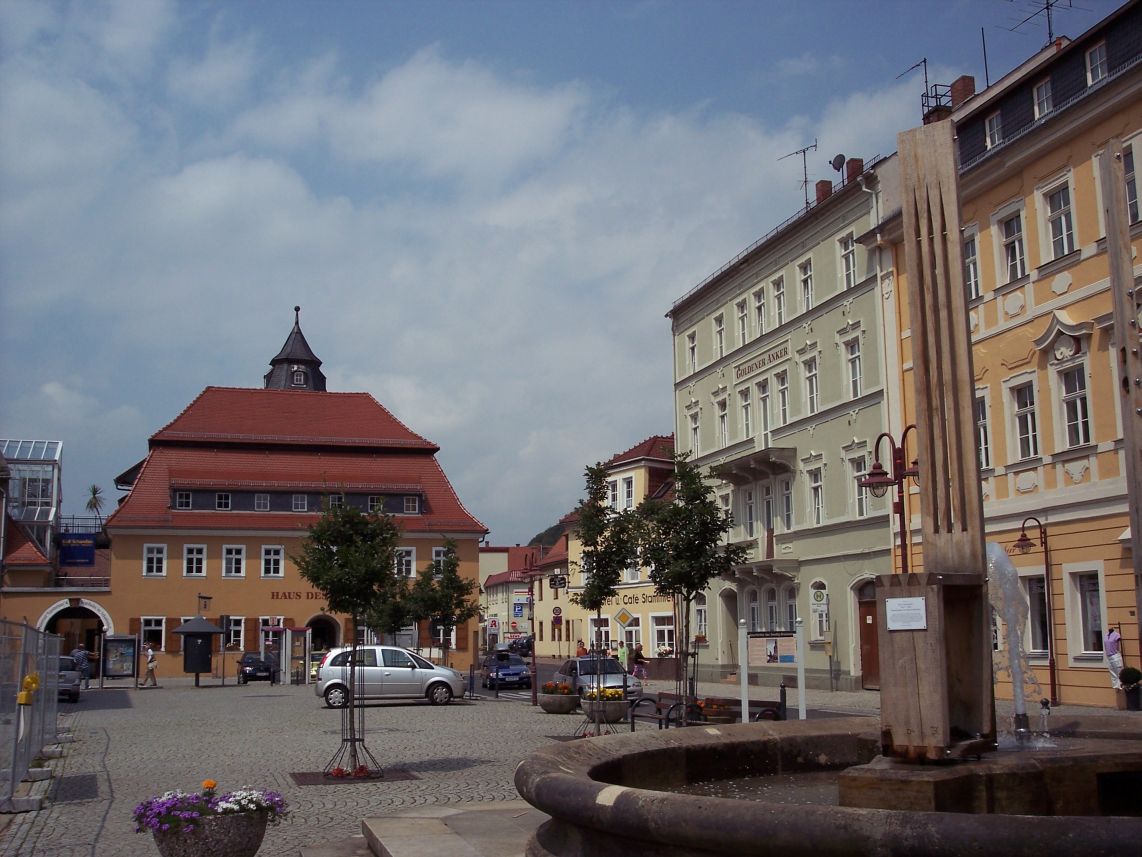 Bad Schandaus Marktplatz mit dem Rathaus als Zentrum des kleinen Ortes. Leider quält sich an manchen Tagen viel Autoverkehr Richtung Tschechien hier durch.