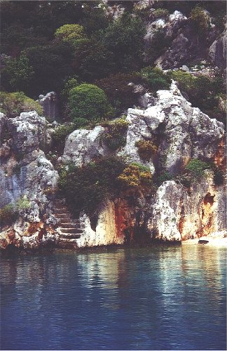 Die nach einem Erdbeben versunkene Stadt Kekova. Im klaren Wasser sind während einer Schiffsfahrt darüber deutlich zahlreiche Mauerreste zu sehen.
