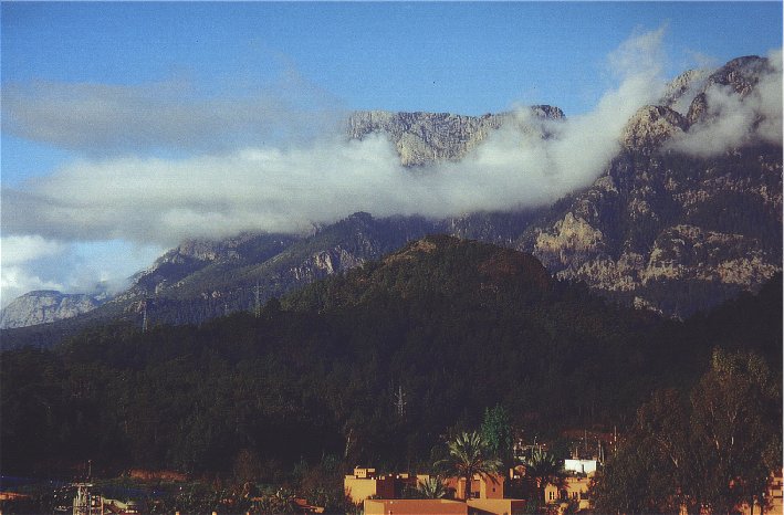 Unmittelbar hinter der Hotelanlage mit ihren Pools und Palmen stiegen die steilen Berge des Taurus in die Höhe. Blick vom Hotelbalkon am zeitigen Morgen.